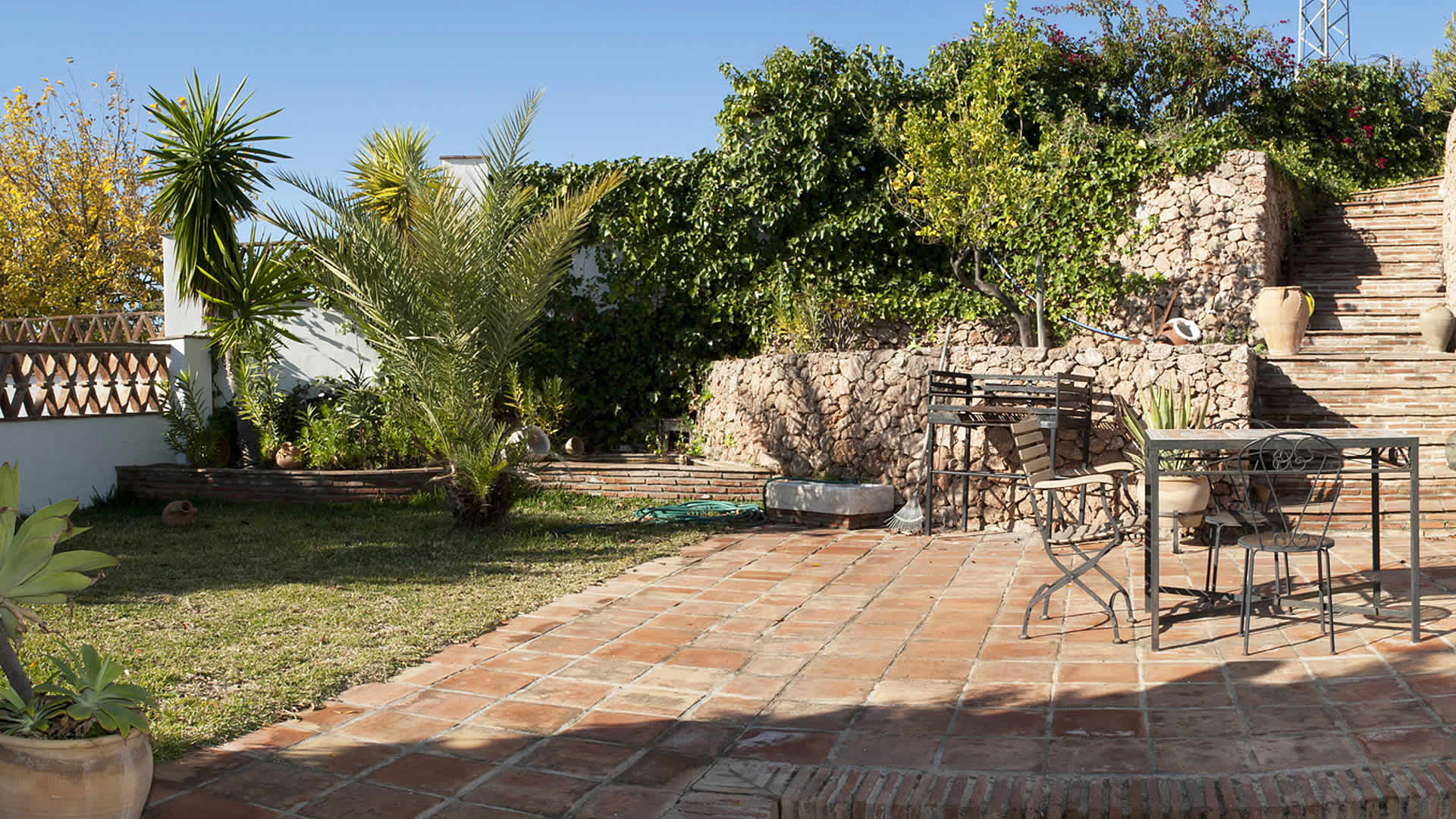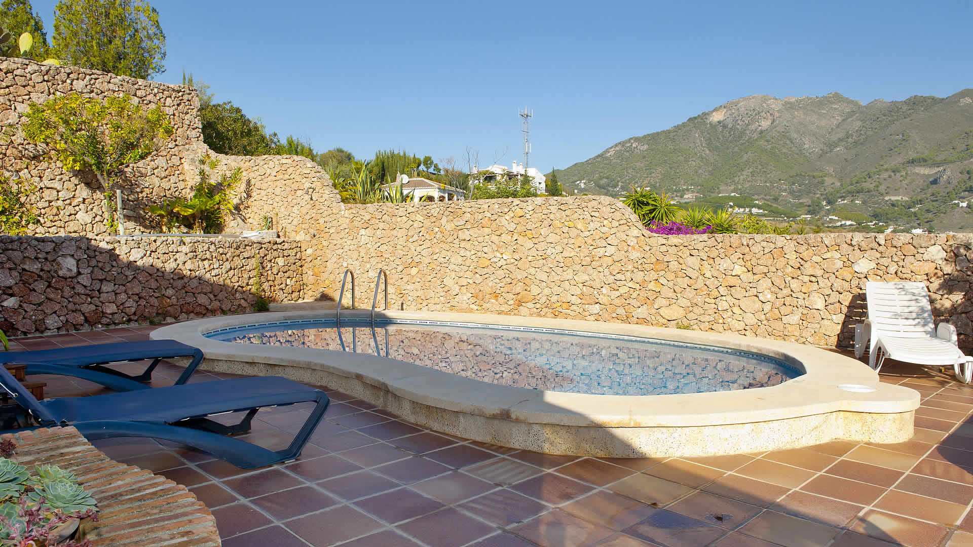 Dieses 3,5 km von Frigiliana entfernt, mitten im Land liegende Haus ist ein bequemes und friedliches Refugium für eine kleine Familie. Der terrassierte Garten, der vor der Eingangstür eine kleine Rasenfläche mit Fischteich hat, ist mit Blumen, Büschen und Obstbäumen bestückt. Der nierenförmige Pool (7 x 3m) befindet sich in einer zurückgezogenen Ecke auf einer der Terrassen und ist mit einer Pool-Dusche, Gartenmöbeln und Sonnenliegen mit Schattenspendern ausgestattet. Die nach Osten liegende Veranda, zu der man vom Pool-Bereich aus einen direkten Zugang hat, ebenso wie vom Wohnzimmer aus, in diesem Fall durch eine Terrassentür, ist der ideale Platz für eine Siesta im Schatten oder für ein Grilldinner. Die Strände von Nerja (7,6 km) sind von hier nur 10-15 Autominuten entfernt.