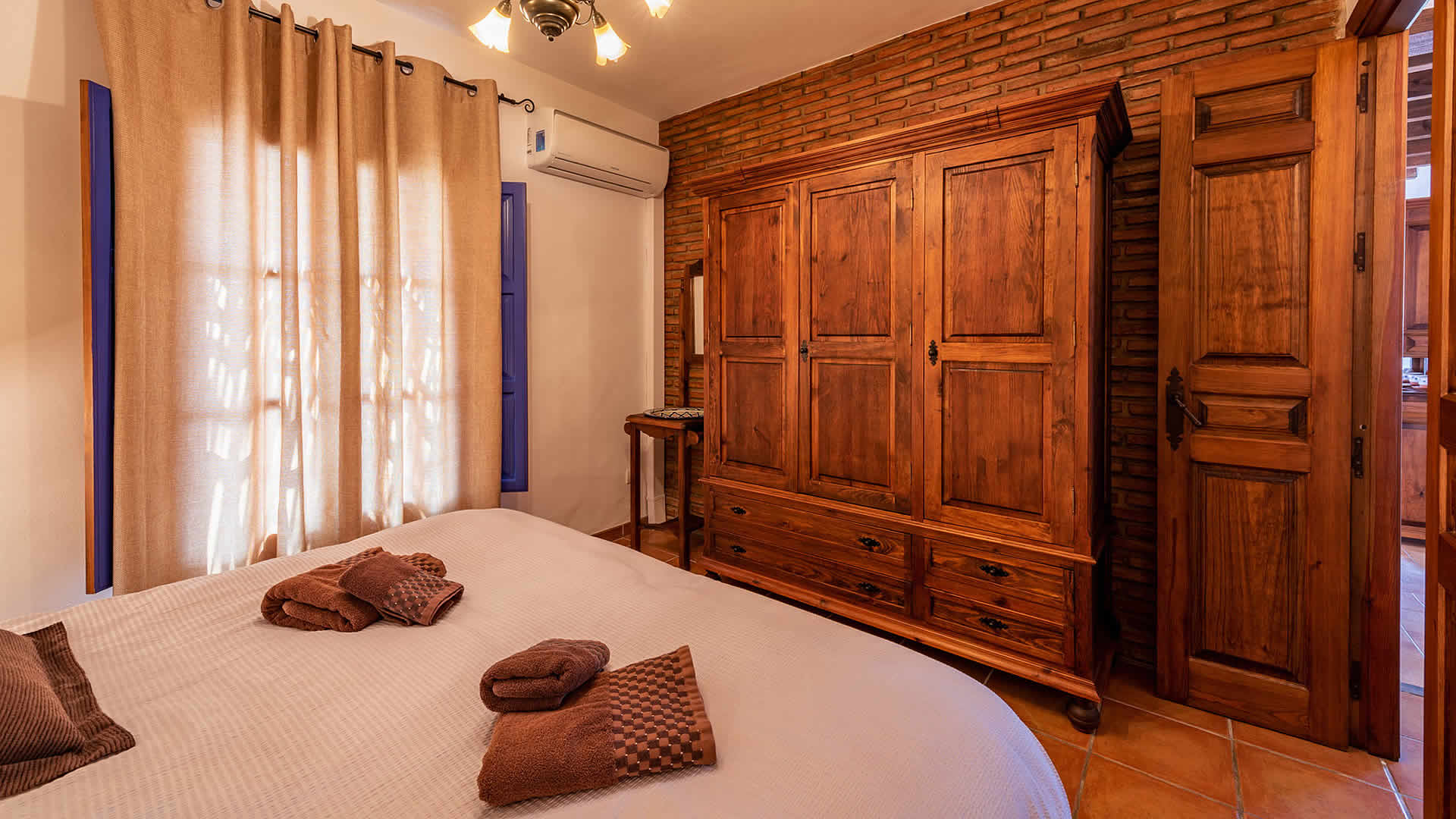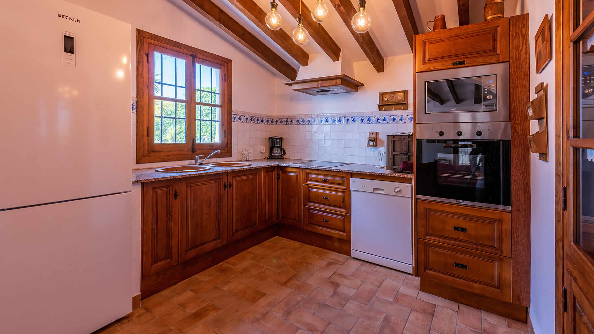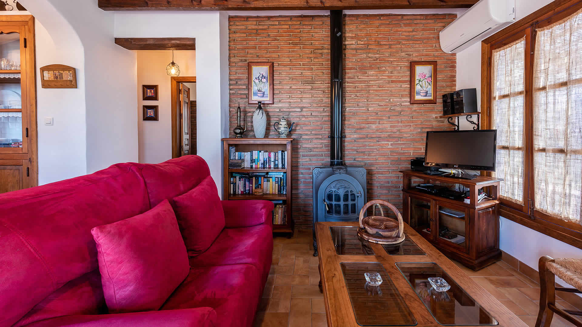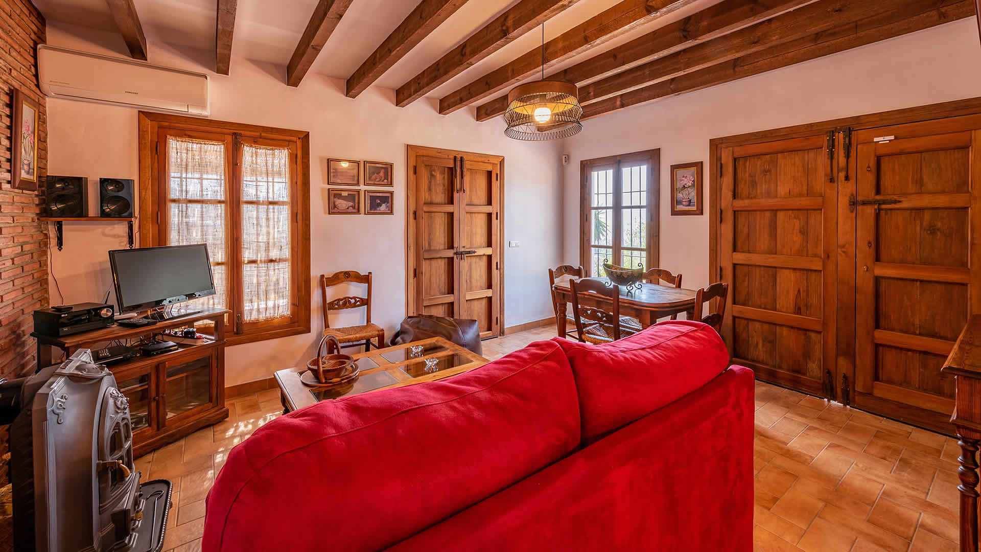 Die Räume befinden sich alle zu ebener Erde, sind sehr geschmackvoll eingerichtet und in einem rustikalen andalusischen Stil gehalten. Der offene Wohnbereich geht in eine geräumige Küche über, die eine flache Stufe höher liegt. Der Wohnbereich hat ein Fernsehgerät, eine Musikanlage und einen Holzbrennofen, der im Winter für Wärme sorgt. Die Decken sind im gesamten Haus sehr hoch und vermitteln an heiÃen Sommertagen ein Gefühl von Geräumigkeit und Frische. GroÃzügige Fenster und Terrassentüren (mit eingebautem Moskitonetz) gehen auf die Veranda hinaus. Die vollständig ausgestattete Küche verfügt über ein Ceranfeld, Backofen, Mikrowelle, Geschirrspüler, Kühl-/Gefrierschrank, Wein Kühlschrank und Kaffeemachine (2 Typen). Die Waschmaschine steht in einem Wirtschaftsraum. Das Haus hat zwei Schlafzimmer (1 Zimmer mit Doppelbett, das andere mit zwei Einzelbetten) und einen Duschraum mit WC und Waschbecken.Bitte beobachten Sie:*Das Haus verfügt über WLAN Internet Anschluss (ohne Kosten).* Für einen Zuschlag von 50⬠pro Woche verfügt man auch über Klimaanlage.