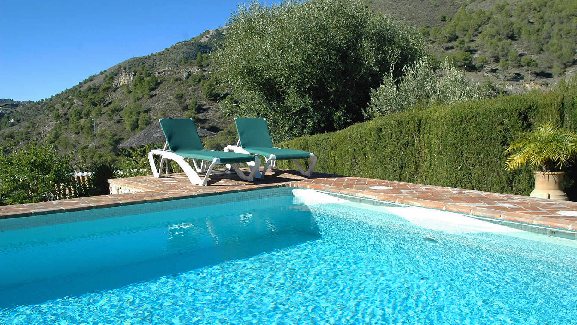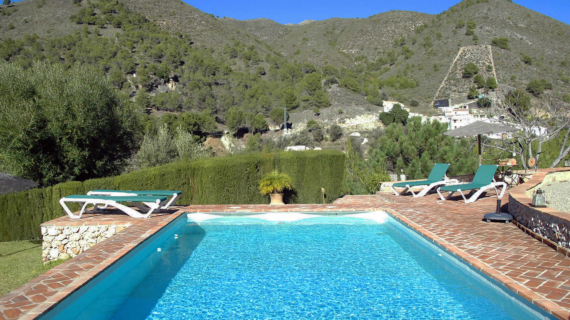Rustic, private, and rural. This is the essence of this wonderful location. The valley hides at a 10 minute drive from Frigiliana, an enjoyable trip through the mountains. The access has some pronounced curves but doesn't give any problems as the track is fully surfaced with concrete. The cortijo is set on generous grounds and has several sitting corners with flowers and trees. There is an attractive barbecue area and shady porch with patio furniture. The private pool (7m x 4m long and 1.7m - 1.0m deep) comes with sun loungers and is on a higher level giving panoramic views over the valley and also to the hamlet El Acebuchal (1 km), a tiny village with an interesting history. Its inhabitants were forced to abandon the hamlet in 1949 by the Franco regime. El Acebuchal remained unoccupied and fell into ruin until 1998 when a descendant of one of the original villagers bought a house there. He encouraged others to help renovate the 32 homes, town hall, chapel, bar, and streets that make up El Acebuchal. The works have been carried out with great care and attention to details, to return the village to its former glory. There are no shops here but there is a bar restaurant that serves up local dishes such as game, wild boar, and goat. In the whitewashed village of Frigiliana, well worth a visit, you will find a wide selection of shops, tapa bars, and restaurants. If you can tear yourself away from this idyllic spot, then you may also visit Nerja (9 km) where you can enjoy its beautiful beaches and take a dive in the Mediterranean.Note: Low by the ground (sports) cars may not be able to access the property