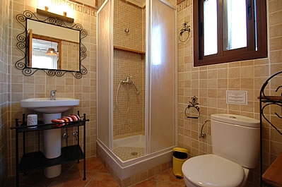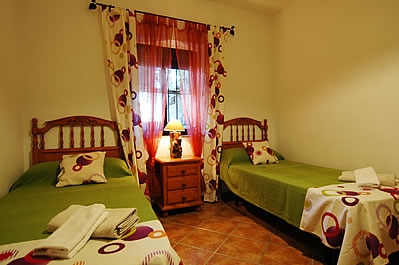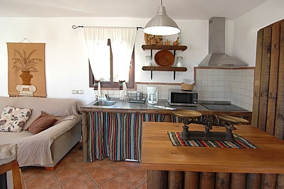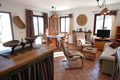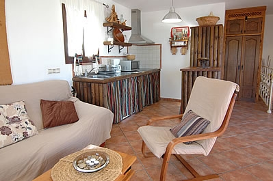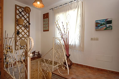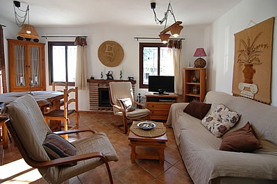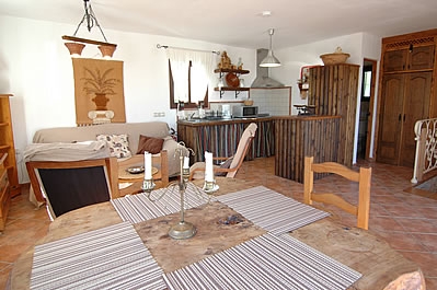 Die Räume sind auf zwei Etagen verteilt und mit Holz und alten Kacheln im attraktiven typisch andalusischem Stil dekoriert. Das Wohn-/Esszimmer liegt im Erdgeschoss und hat einen offenen Kamin, einen Esstisch für 4 Personen, ein Sofa, 2 Sessel, einen DVD-Player und Satelliten-TV. Die Küche ist mit einem Ceramfeld mit 4 Kochstellen, Mikrowelle, Kühlschrank/Gefrierfach und Geschirrspüler ausgestattet. Die Waschmaschine befindet sich im Aussenbereich, neben dem Grill. Auf dieser Etage gibt es außerdem eine Dusche mit WC.