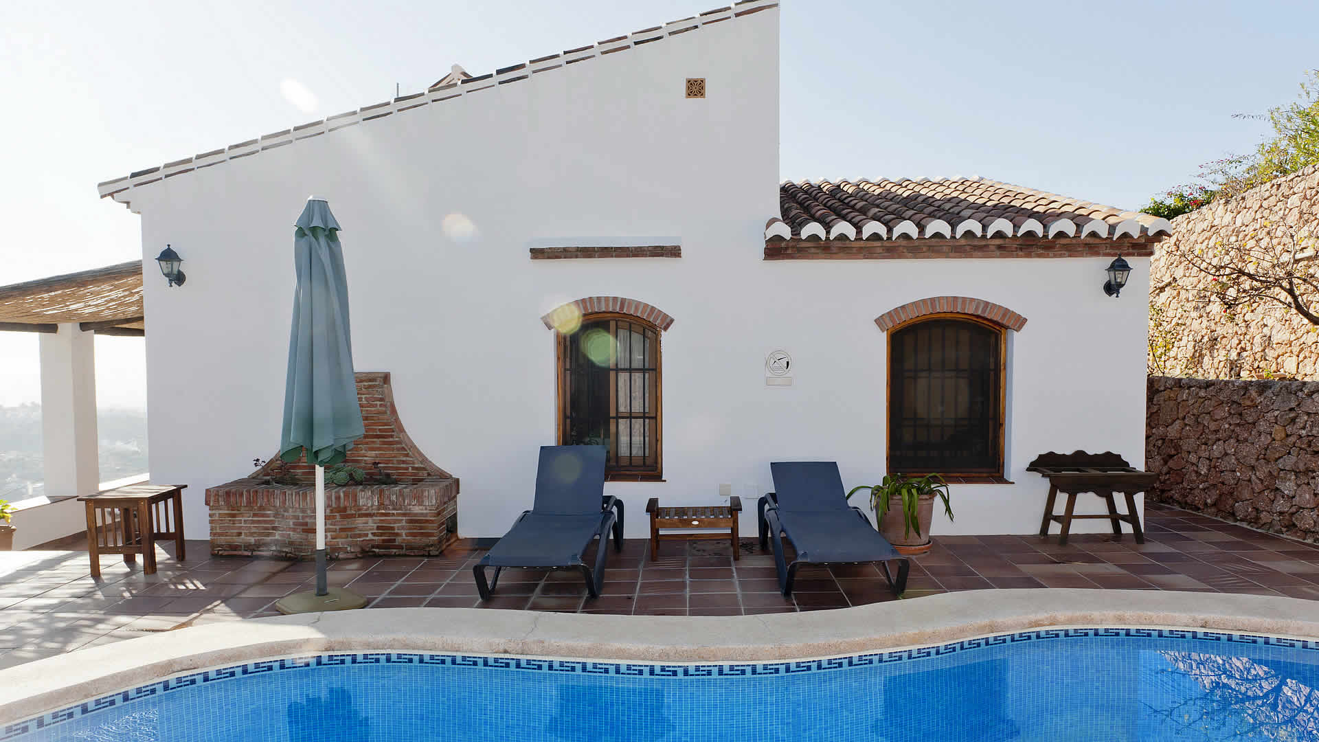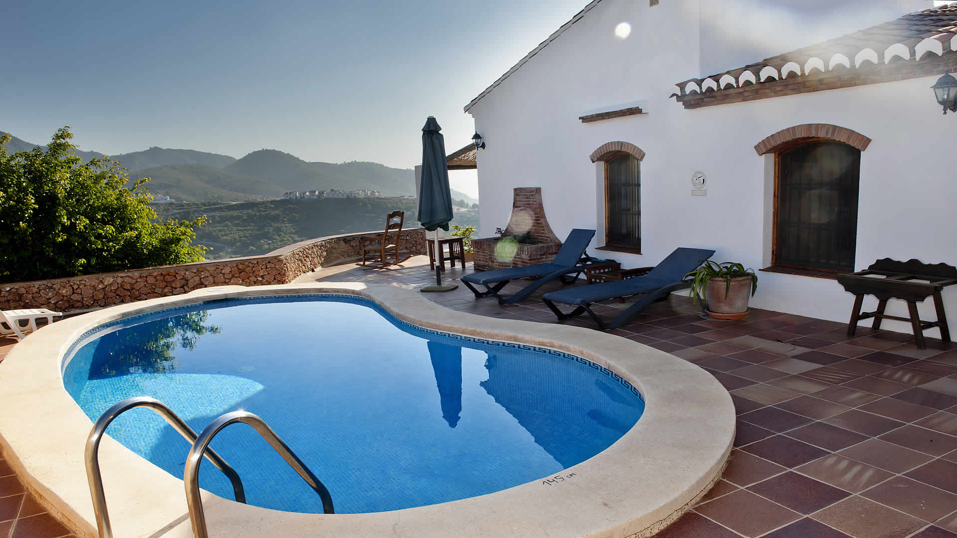 Dieses 3,5 km von Frigiliana entfernt, mitten im Land liegende Haus ist ein bequemes und friedliches Refugium für eine kleine Familie. Der terrassierte Garten, der vor der Eingangstür eine kleine Rasenfläche mit Fischteich hat, ist mit Blumen, Büschen und Obstbäumen bestückt. Der nierenförmige Pool (7 x 3m) befindet sich in einer zurückgezogenen Ecke auf einer der Terrassen und ist mit einer Pool-Dusche, Gartenmöbeln und Sonnenliegen mit Schattenspendern ausgestattet. Die nach Osten liegende Veranda, zu der man vom Pool-Bereich aus einen direkten Zugang hat, ebenso wie vom Wohnzimmer aus, in diesem Fall durch eine Terrassentür, ist der ideale Platz für eine Siesta im Schatten oder für ein Grilldinner. Die Strände von Nerja (7,6 km) sind von hier nur 10-15 Autominuten entfernt.