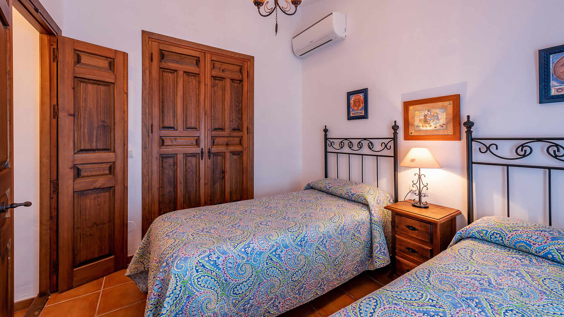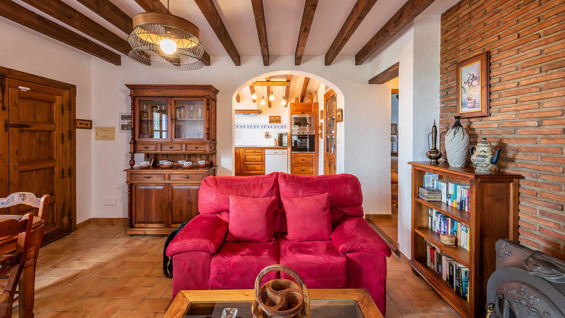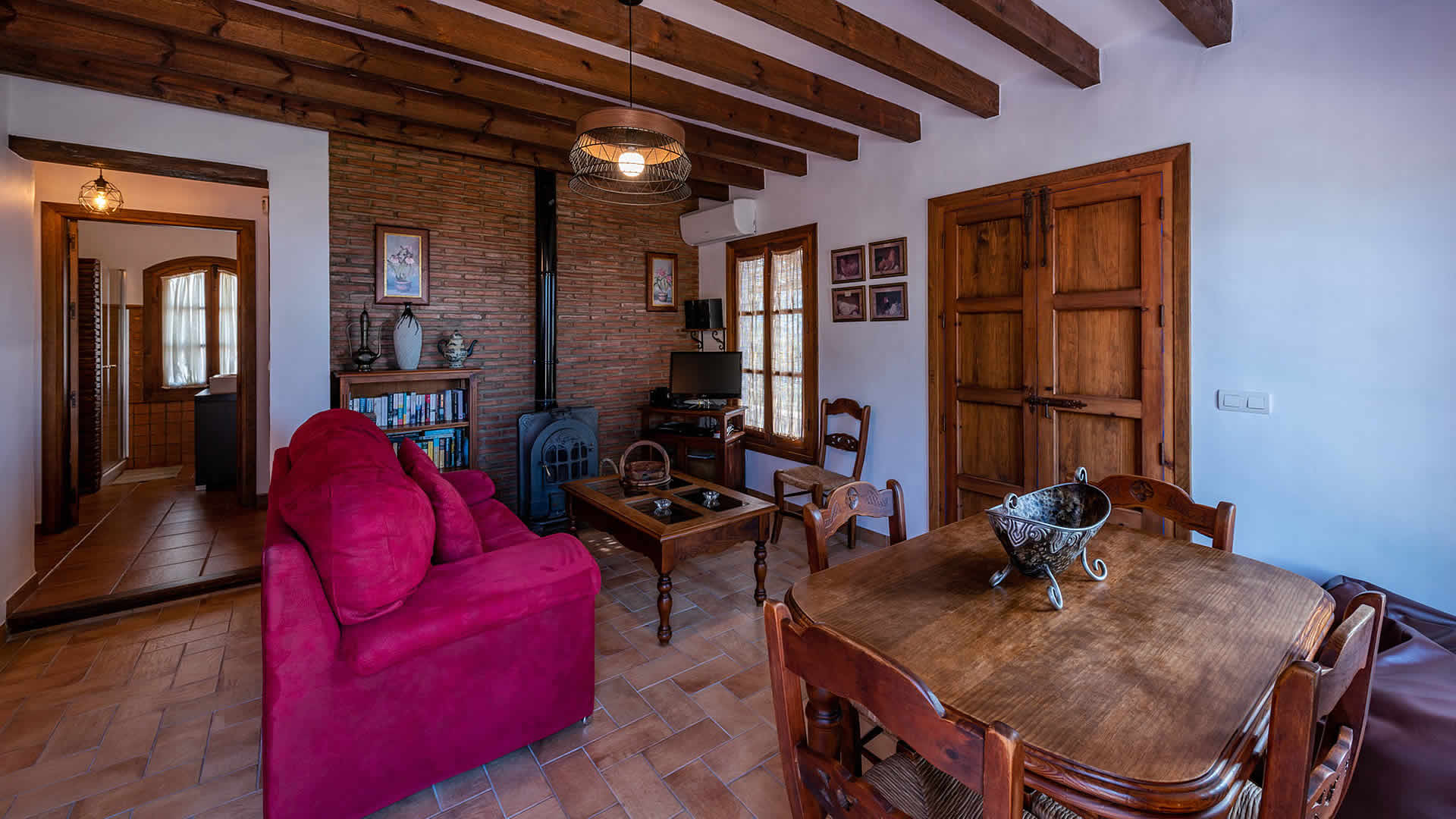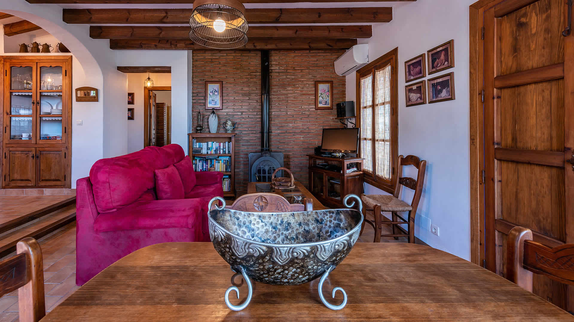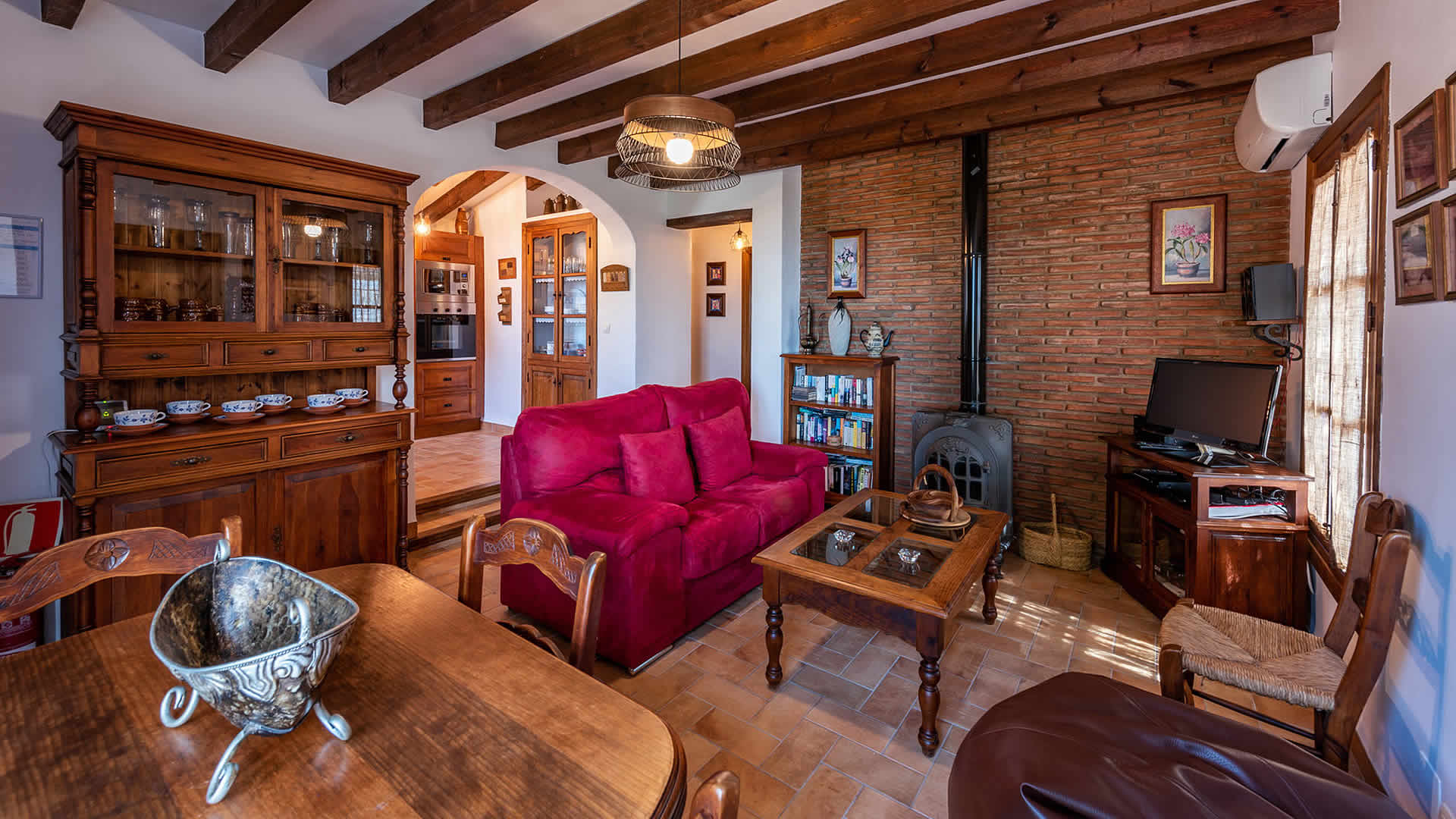 Die Räume befinden sich alle zu ebener Erde, sind sehr geschmackvoll eingerichtet und in einem rustikalen andalusischen Stil gehalten. Der offene Wohnbereich geht in eine geräumige Küche über, die eine flache Stufe höher liegt. Der Wohnbereich hat ein Fernsehgerät, eine Musikanlage und einen Holzbrennofen, der im Winter für Wärme sorgt. Die Decken sind im gesamten Haus sehr hoch und vermitteln an heiÃen Sommertagen ein Gefühl von Geräumigkeit und Frische. GroÃzügige Fenster und Terrassentüren (mit eingebautem Moskitonetz) gehen auf die Veranda hinaus. Die vollständig ausgestattete Küche verfügt über ein Ceranfeld, Backofen, Mikrowelle, Geschirrspüler, Kühl-/Gefrierschrank, Wein Kühlschrank und Kaffeemachine (2 Typen). Die Waschmaschine steht in einem Wirtschaftsraum. Das Haus hat zwei Schlafzimmer (1 Zimmer mit Doppelbett, das andere mit zwei Einzelbetten) und einen Duschraum mit WC und Waschbecken.Bitte beobachten Sie:*Das Haus verfügt über WLAN Internet Anschluss (ohne Kosten).* Für einen Zuschlag von 50⬠pro Woche verfügt man auch über Klimaanlage.