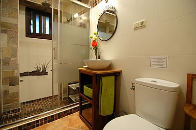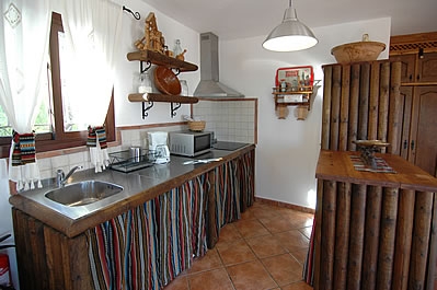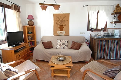 Die Räume sind auf zwei Etagen verteilt und mit Holz und alten Kacheln im attraktiven typisch andalusischem Stil dekoriert. Das Wohn-/Esszimmer liegt im Erdgeschoss und hat einen offenen Kamin, einen Esstisch für 4 Personen, ein Sofa, 2 Sessel, einen DVD-Player und Satelliten-TV. Die Küche ist mit einem Ceramfeld mit 4 Kochstellen, Mikrowelle, Kühlschrank/Gefrierfach und Geschirrspüler ausgestattet. Die Waschmaschine befindet sich im Aussenbereich, neben dem Grill. Auf dieser Etage gibt es außerdem eine Dusche mit WC.