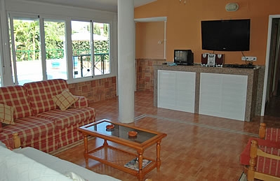 La vivienda tiene las estancias dividas entre dos plantas y esta decorado con gusto por sus propietarios. A la planta baja se accede a través de una entrada que comunica con un salón/ comedor muy acogedor, equipado con 2 sofás, televisión, DVD y aire acondicionado. Una terraza cerrada con vistas a la piscina se ha convertido en un espacio segundo salón, también con sofás, televisión, mesa comedor. La cocina comunica con el segundo salón y esta muy bien equipada con lavavajillas, microondas, horno eléctrico, placa vitro-cerámica y frigorífico/congelador. En esta planta encontramos 5 dormitorios dobles. El 6º dormitorio tiene espacio para 4 personas: hay 2 camas individuales y una cama litera empotrada para 2 personas más. Hay 2 baños completos (con bañera o con ducha). El acceso a la segunda planta es independiente: hay dos dormitorios, uno de ellos con cuatro literas y el otro con dos camas. Baño completo. Aire acondicionado en los dos dormitorios. Gran solarium.