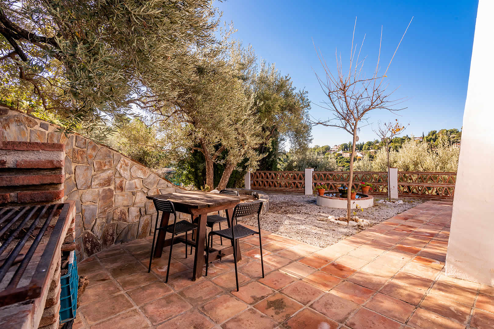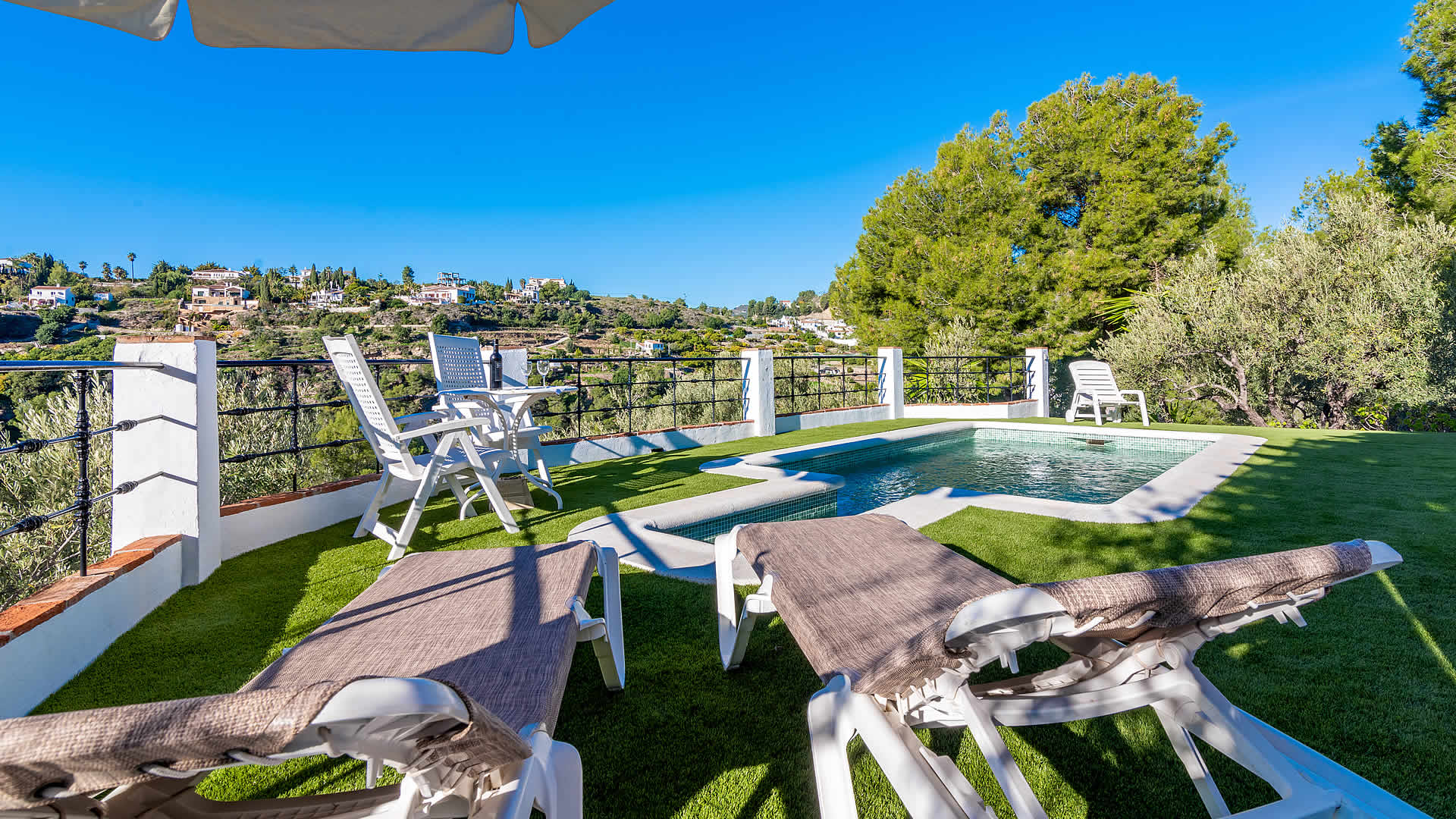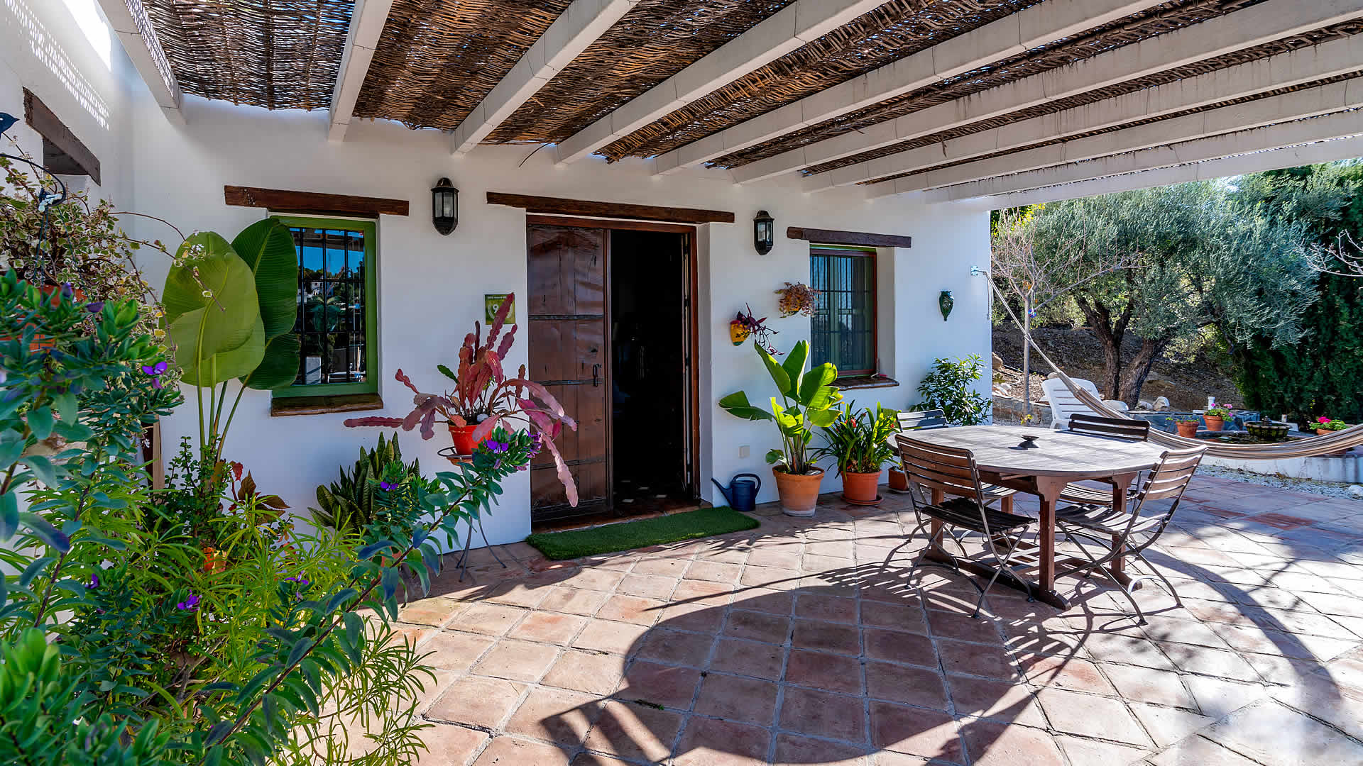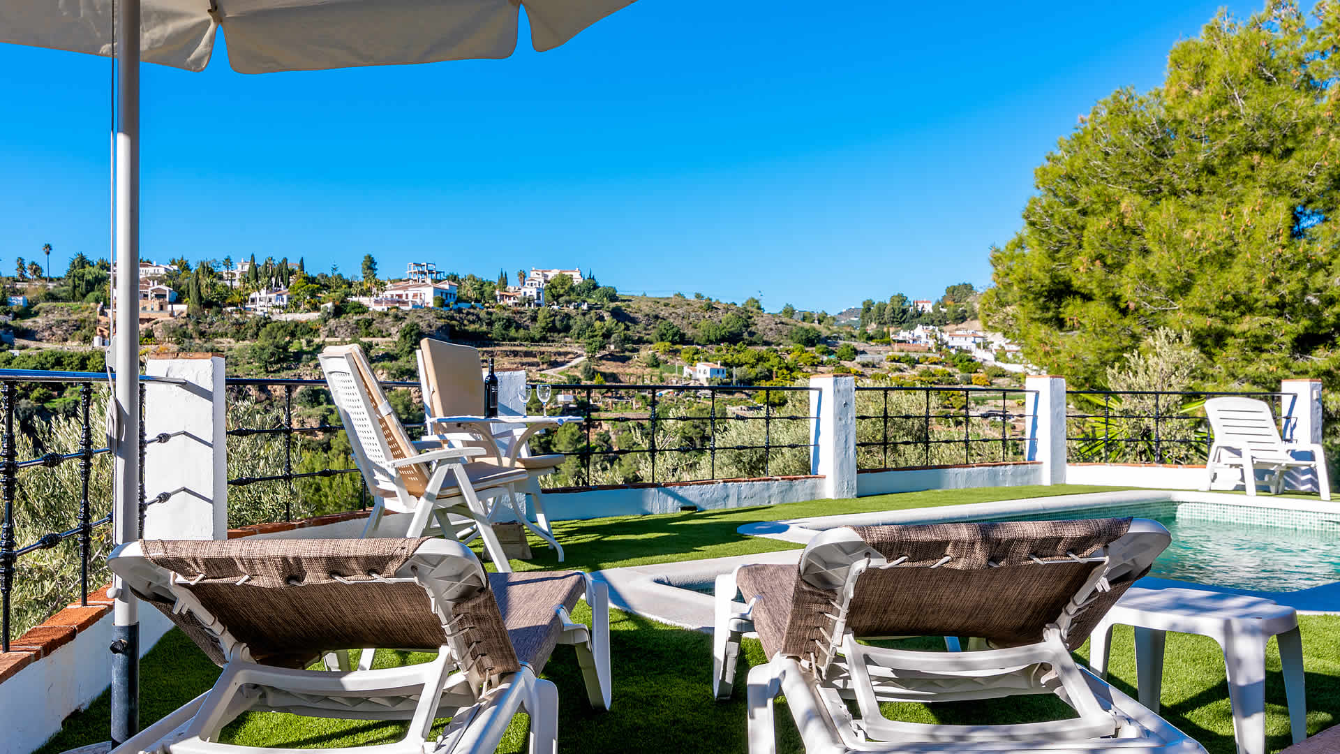 La casa se localiza al norte de Nerja, dentro del Parque Natural de Sierra Tejeda, en plena naturaleza. Está presente la flora y fauna tÃpicamente mediterránea y con un poco de suerte hasta podrá ver ciervos, jabalÃes y otros animales salvajes del Parque! Los últimos 50 metros a la casa se hacen por una empinada pista de cemento. Una vez en la casa nos encontramos con un sombreado porche, un lugar ideal para echar una siesta, con espectaculares vistas a la campiña circundante y que alcanzan hasta la costa. El porche continúa con una soleada terraza equipada con tumbonas y piscina privada (5 x 3m). Se incluye una barbacoa para sus comidas al aire libre.
