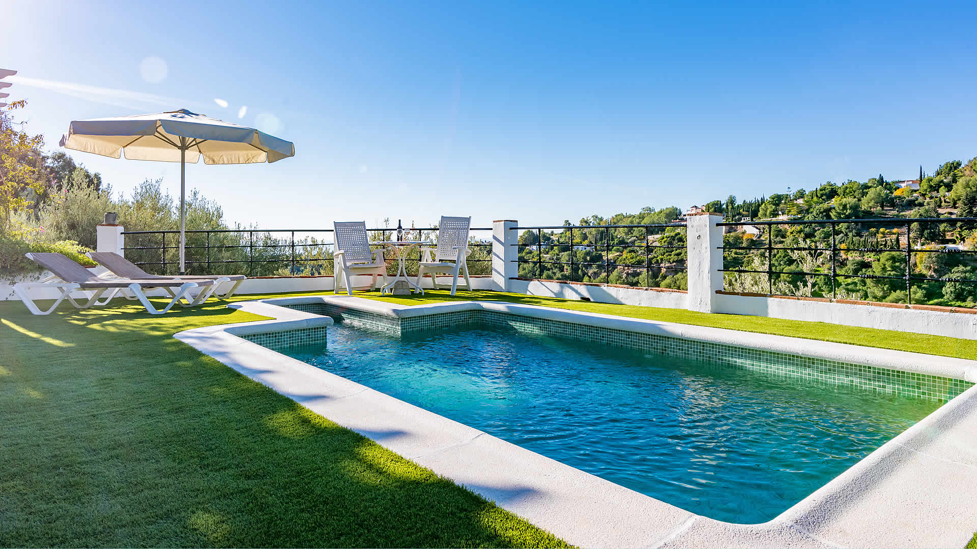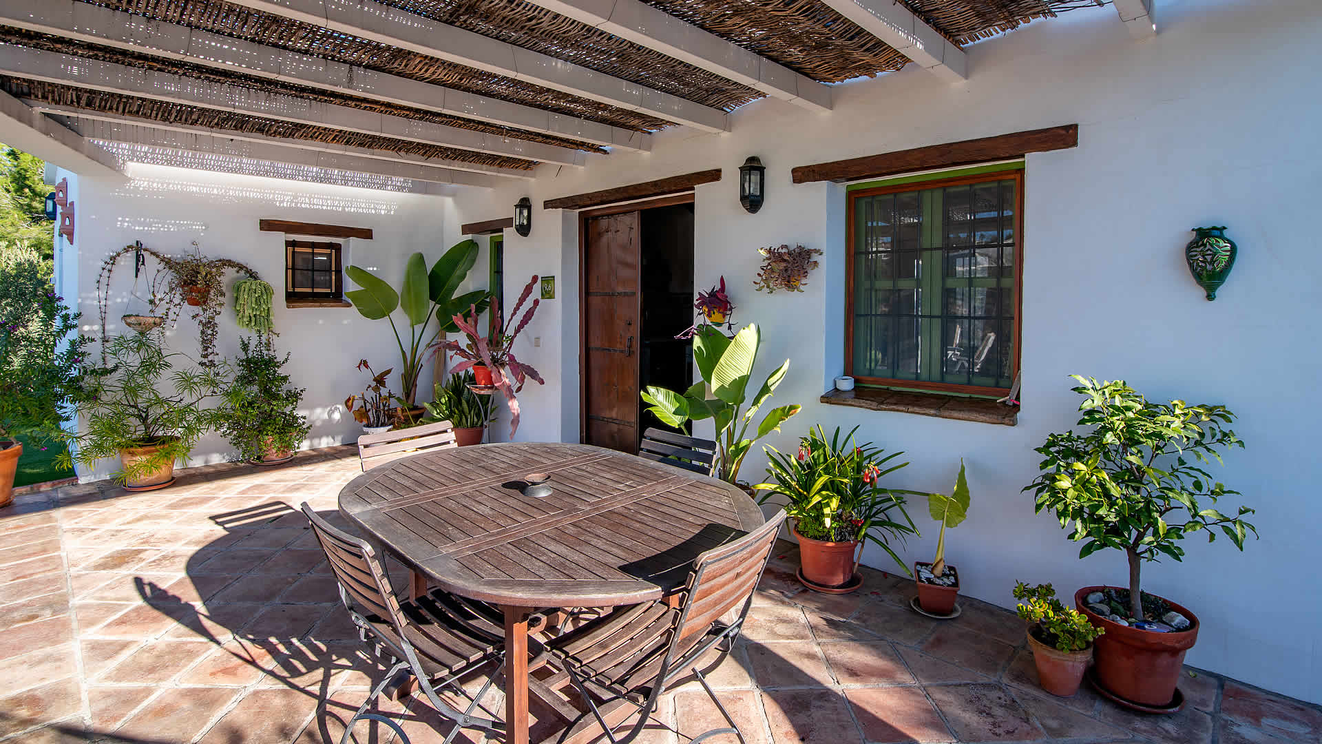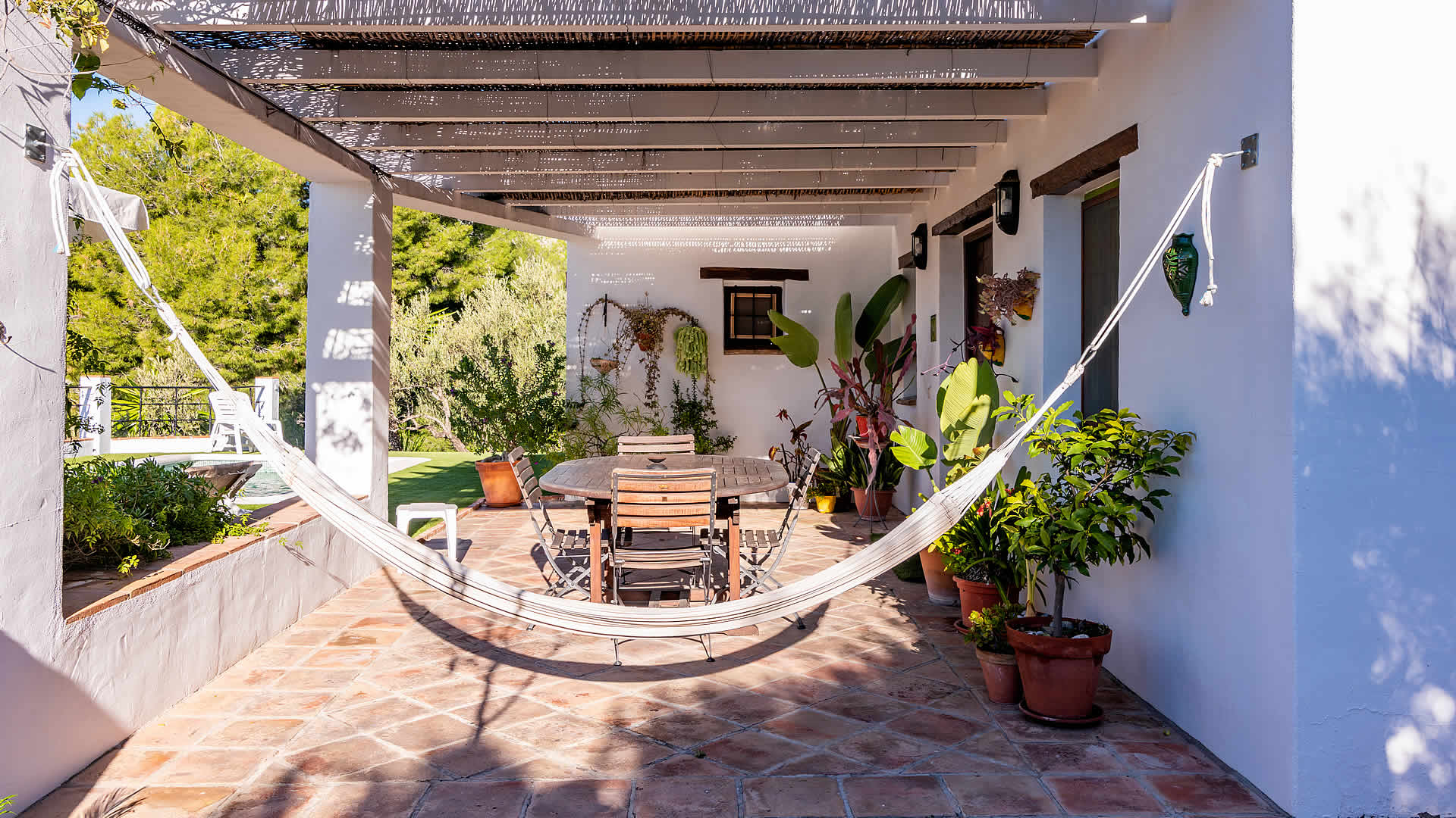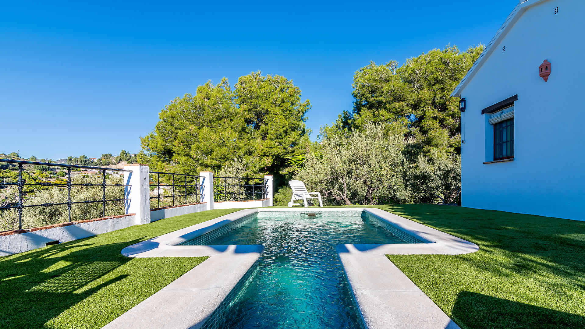 La casa se localiza al norte de Nerja, dentro del Parque Natural de Sierra Tejeda, en plena naturaleza. Está presente la flora y fauna tÃpicamente mediterránea y con un poco de suerte hasta podrá ver ciervos, jabalÃes y otros animales salvajes del Parque! Los últimos 50 metros a la casa se hacen por una empinada pista de cemento. Una vez en la casa nos encontramos con un sombreado porche, un lugar ideal para echar una siesta, con espectaculares vistas a la campiña circundante y que alcanzan hasta la costa. El porche continúa con una soleada terraza equipada con tumbonas y piscina privada (5 x 3m). Se incluye una barbacoa para sus comidas al aire libre.