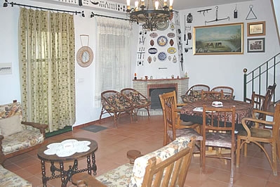 El interior de la casa es sencillo y realizado en estilo clásico. El salón, cocina y baño común se encuentran en la planta baja, los dormitorios y segundo baño en la primera planta. El salón dispone de chimenea, sofá para 3 personas y 2 butacas, mesa comedor para 6 personas y televisión. La cocina está equipada con placa vitrocerámica de 2 fuegos, frigorífico, microondas y lavadora. El baño principal de la vivienda está equipado con wc, lavabo y bañera con ducha. El dormitorio principal tiene cama de matrimonio, los otros dormitorios 2 camas individuales y 1 sofá-cama cada uno. El baño de esta planta es completo con media bañera ducha. Dispone de aire acondicionado en los 3 dormitorios de la planta alta, y de un ventilador en el salón.
